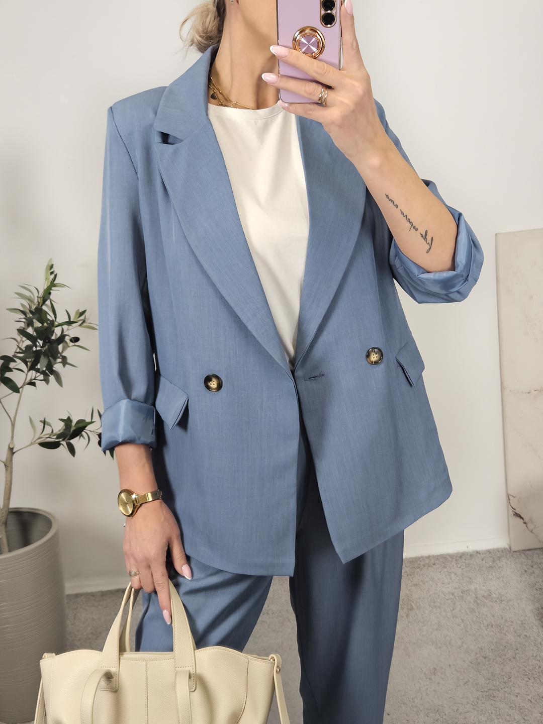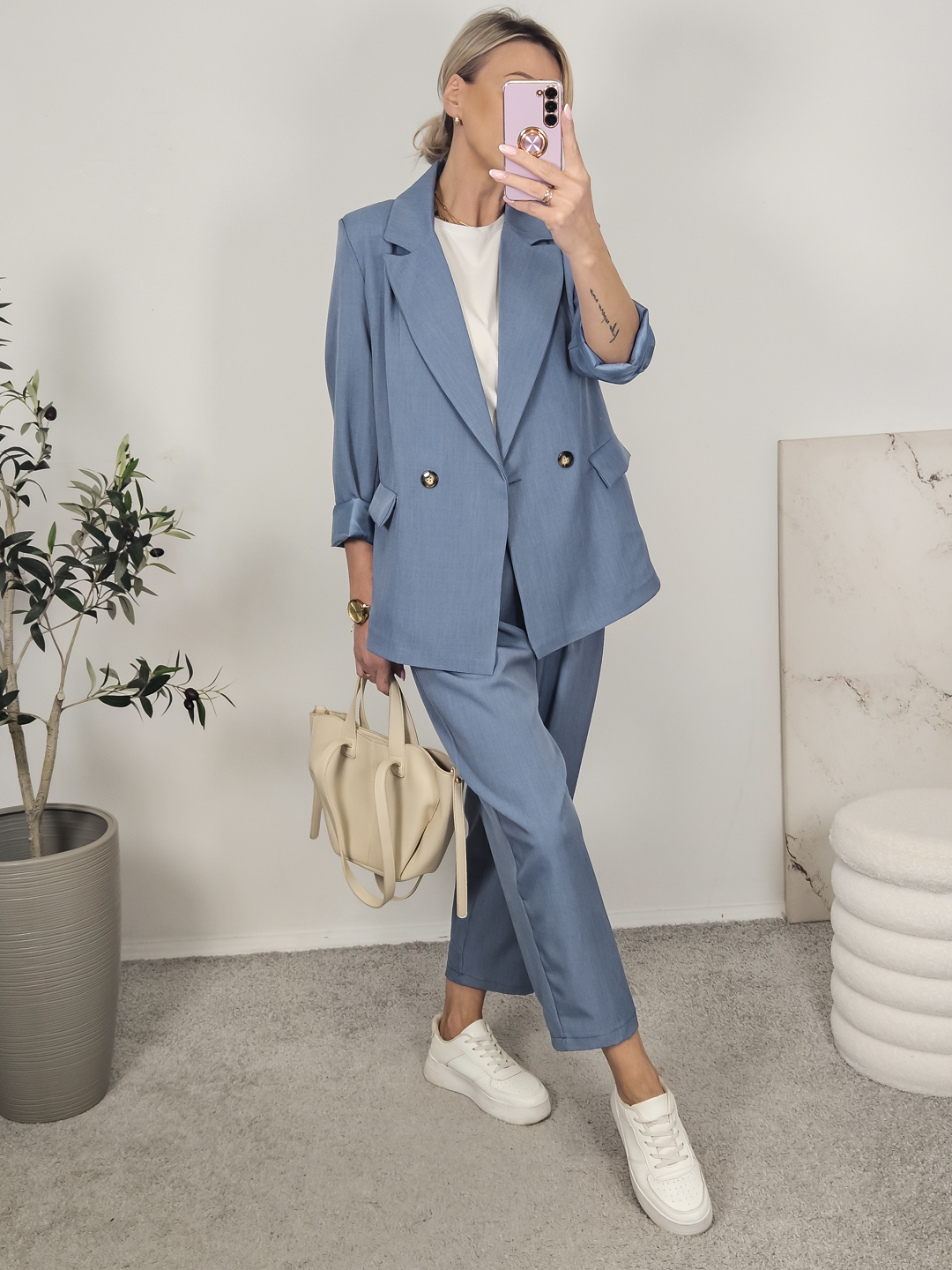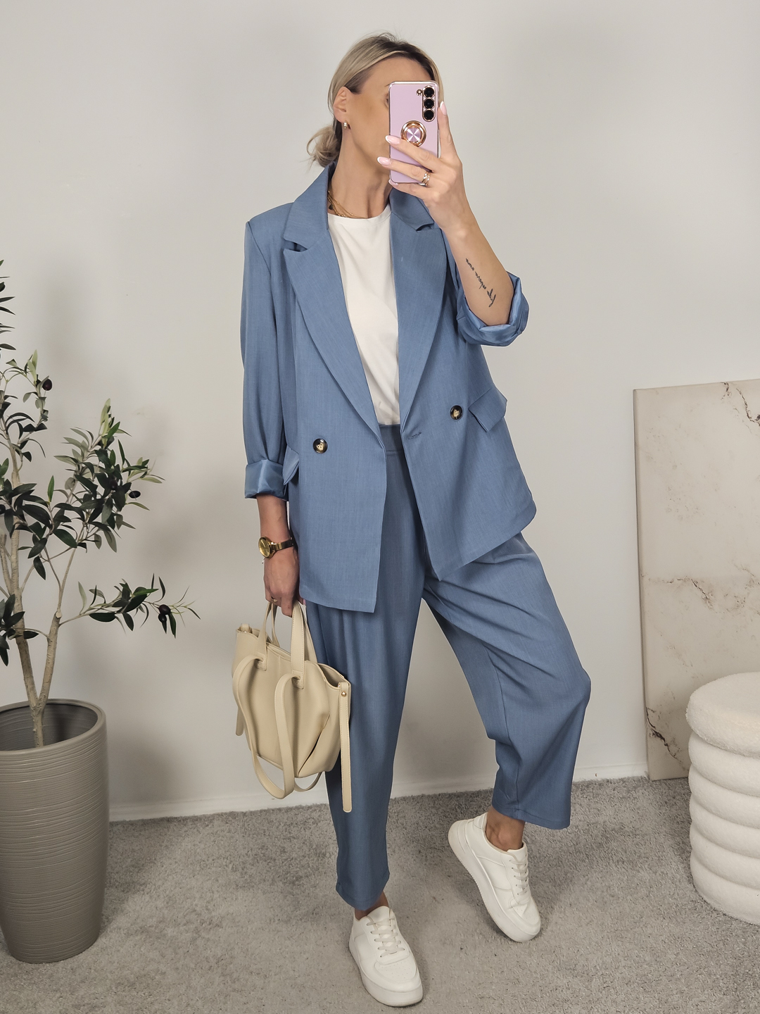 Komplet składający się z marynarki oraz spodni na gumie typu ballon .