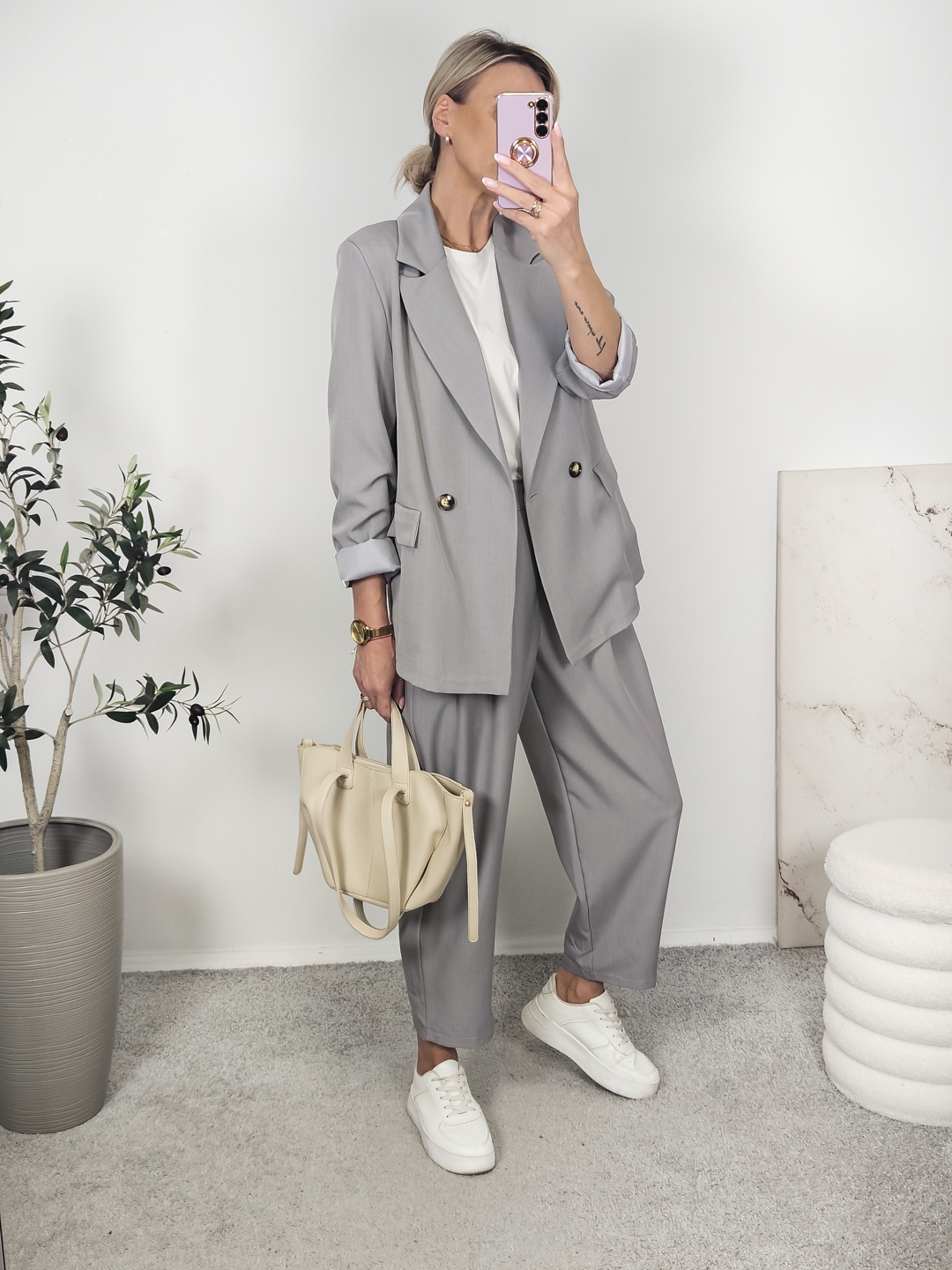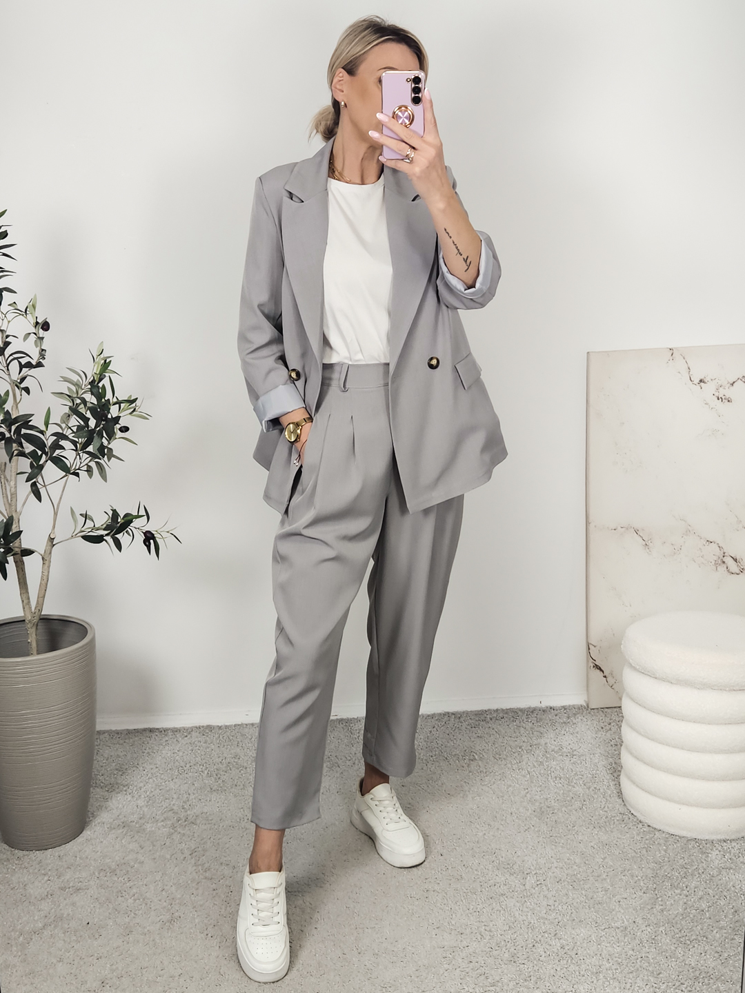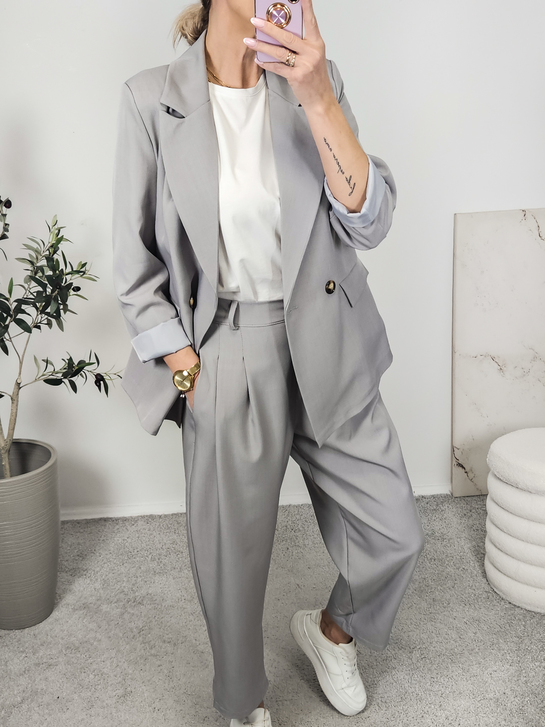 Komplet składający się z marynarki oraz spodni na gumie typu ballon .