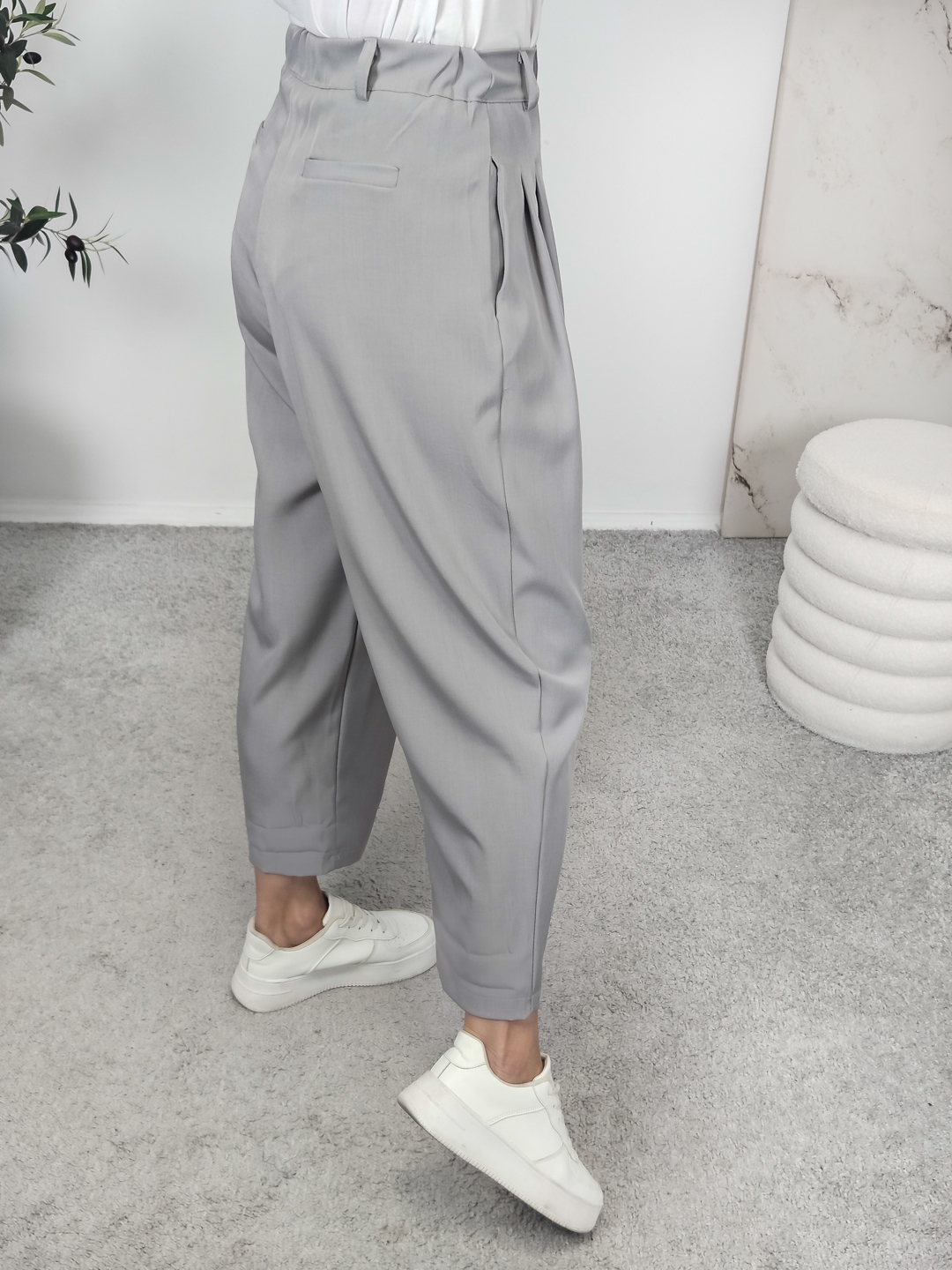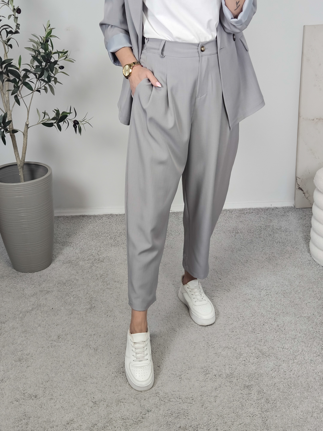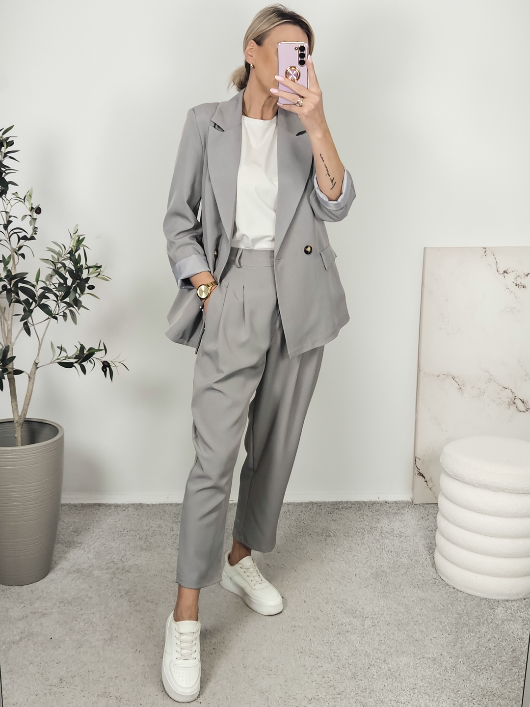 Komplet składający się z marynarki oraz spodni na gumie typu ballon .