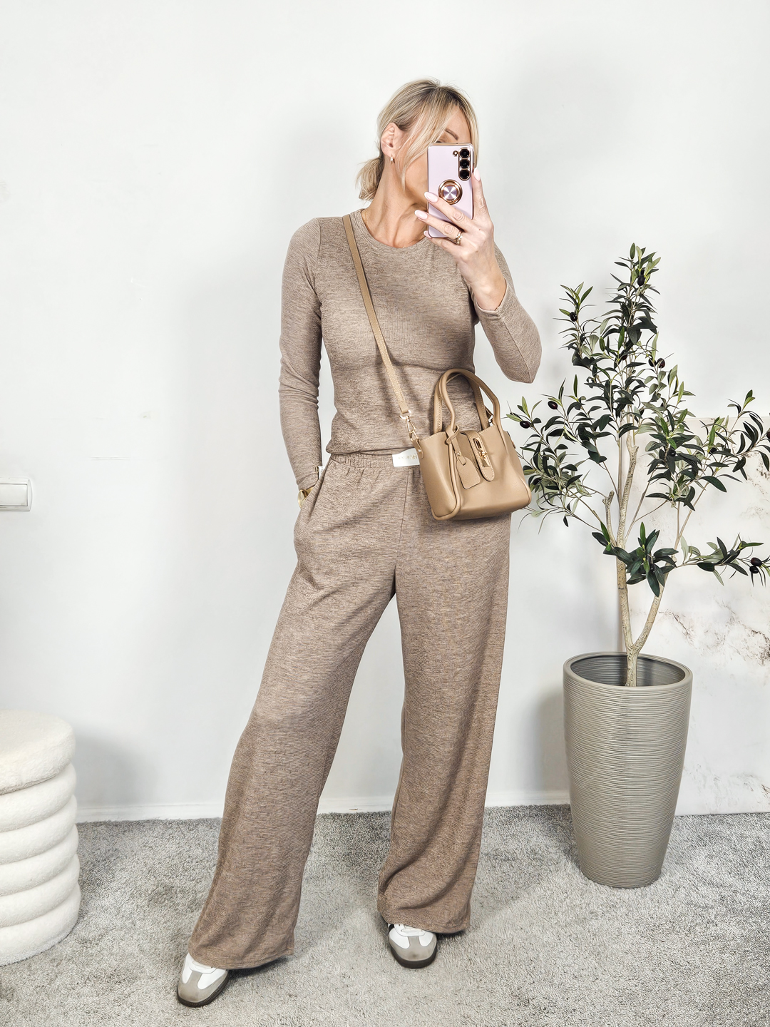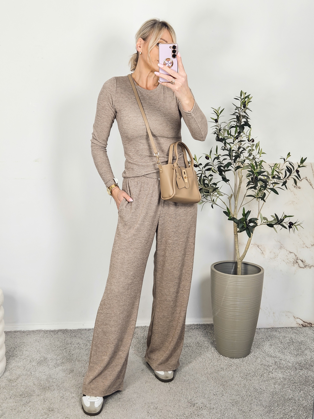 Komplet dzianinowy z dopasowną bluzką i spodniami o szerokich nogawkach- wykonany z wysokiej jakości dzianiny.
