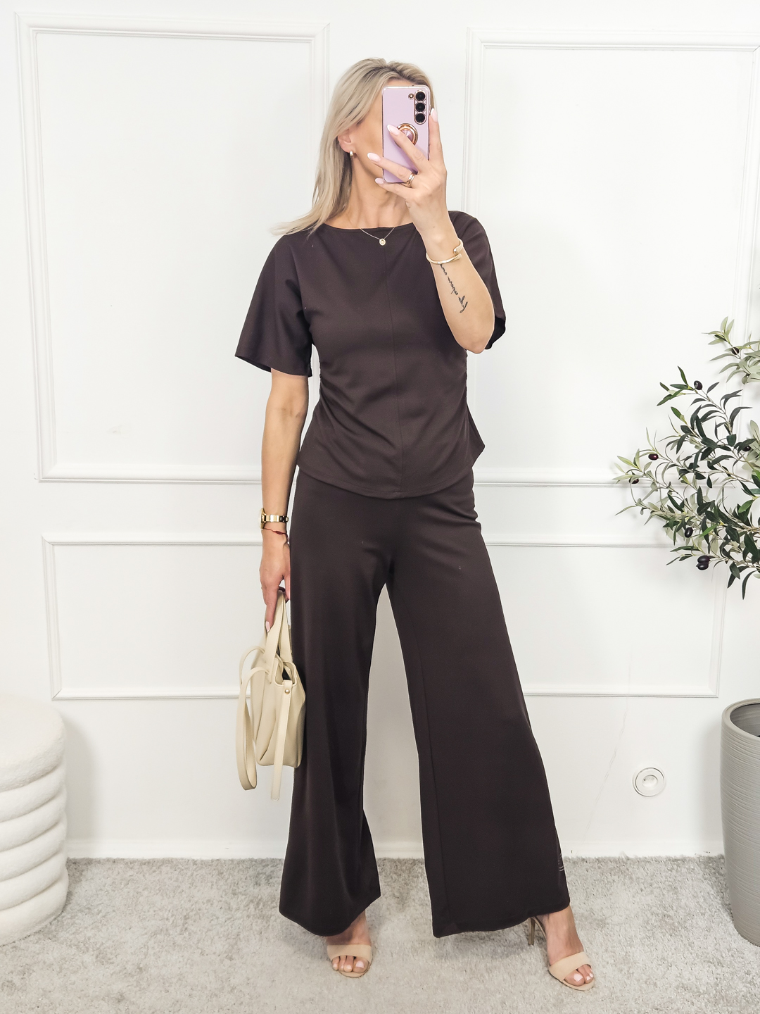 Komplet składający się z bluzki z marszczeniami po bokach ;oraz spodni na gumie.
