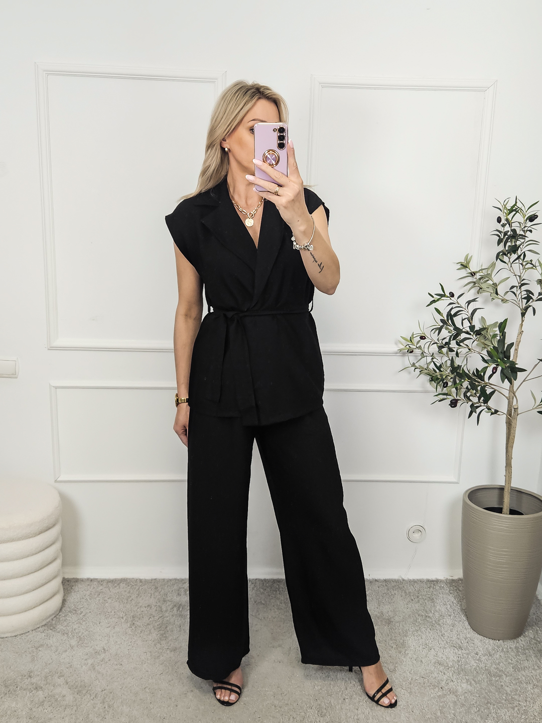 Komplet składający się z kamizeli bez zapięcia/przewiązywanej paskiem oraz spodni na gumie.