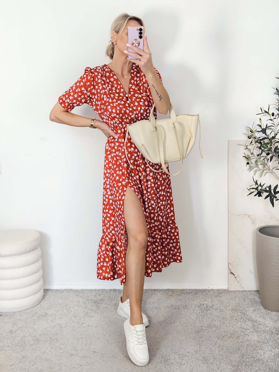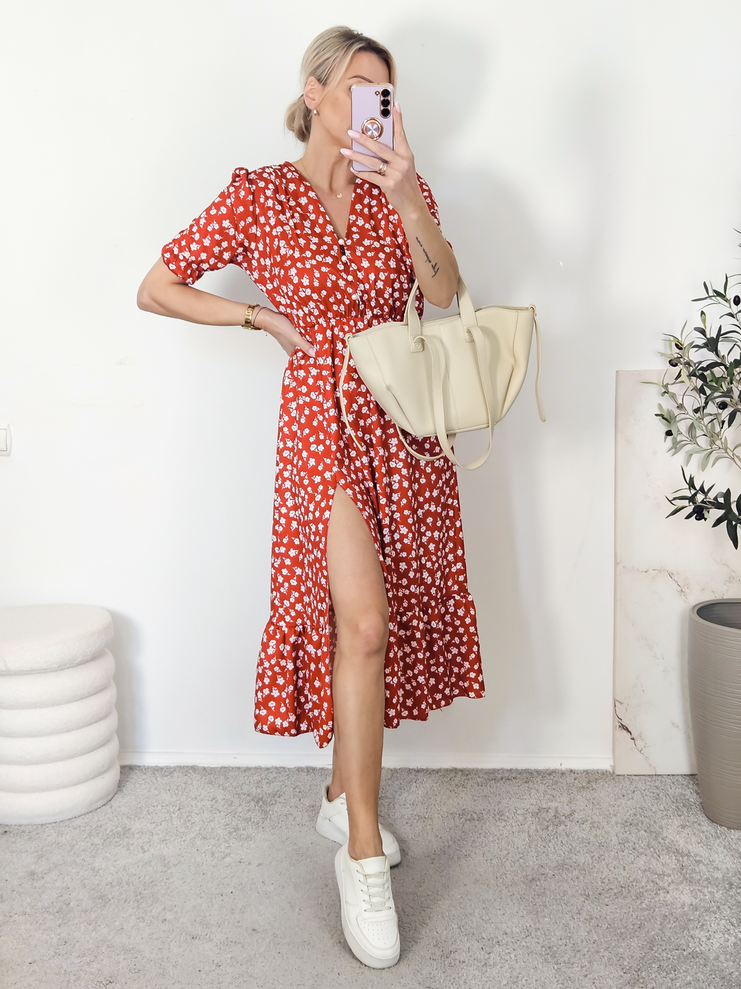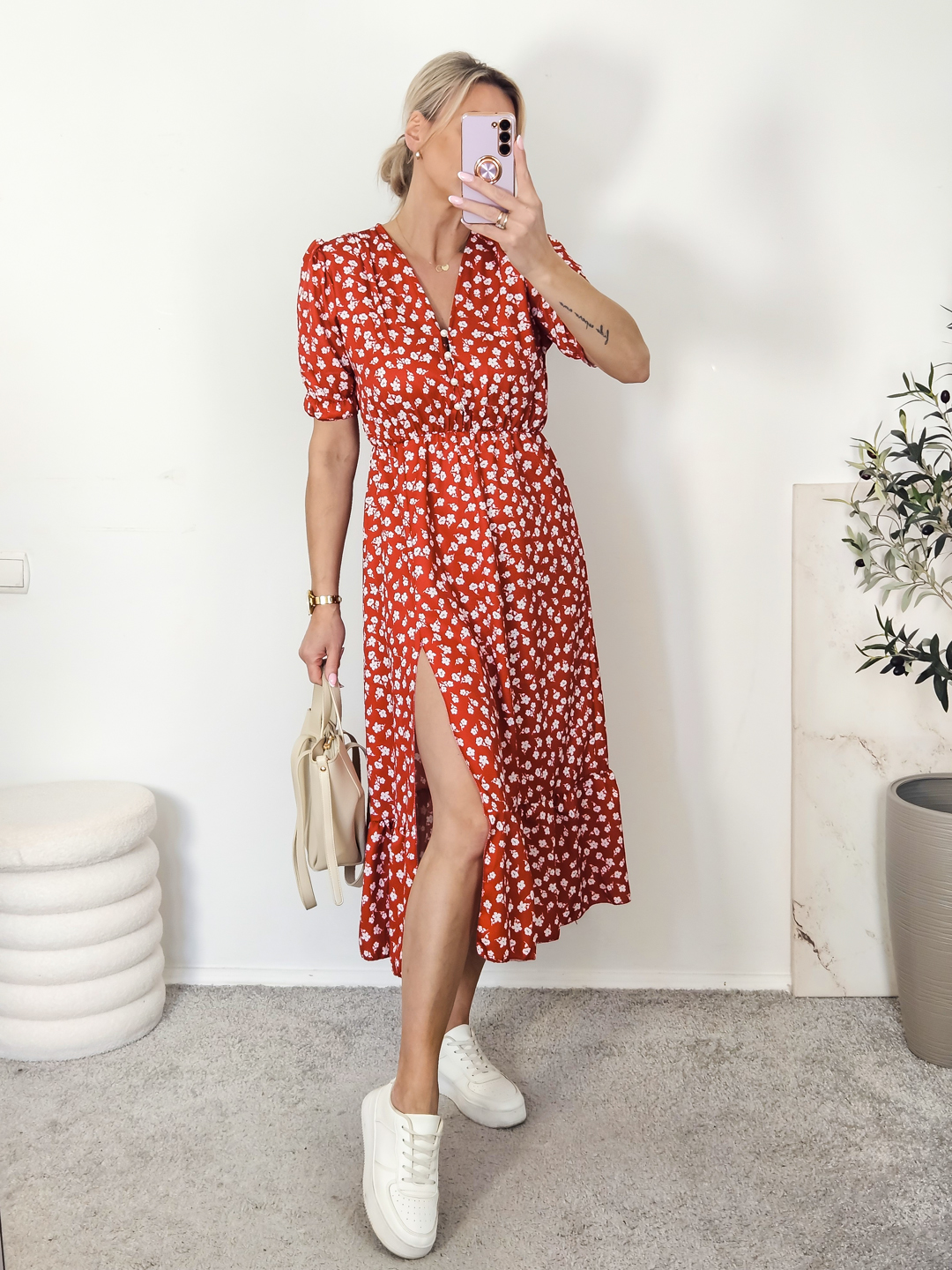 Sukienka zapinana z przodu na guziki, rękawki wykończone gumką.