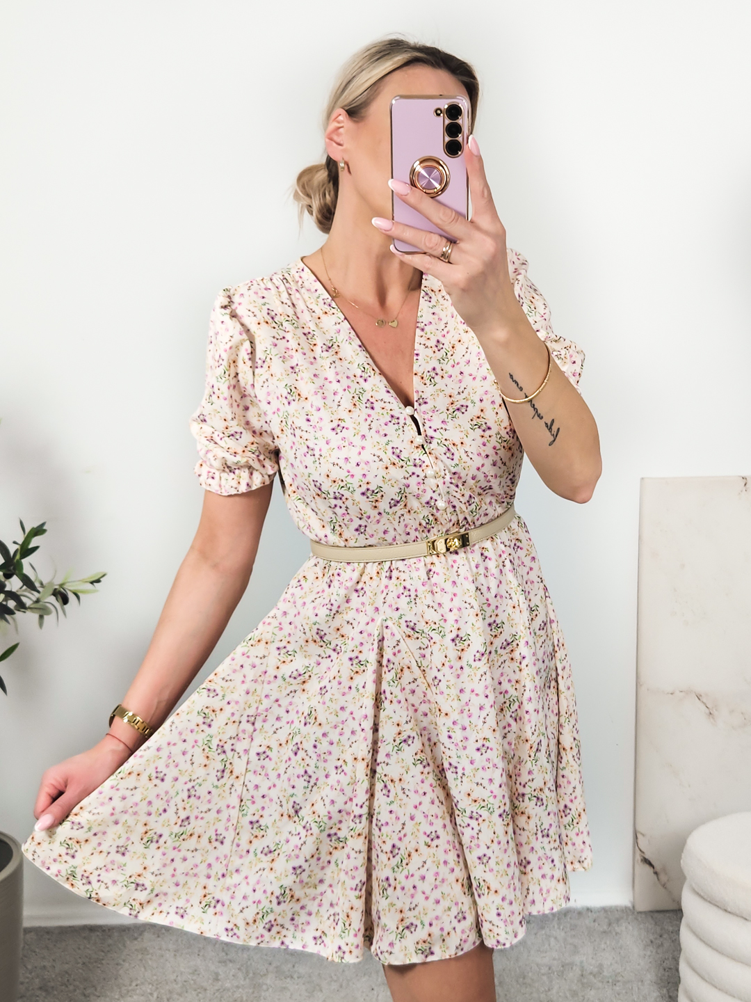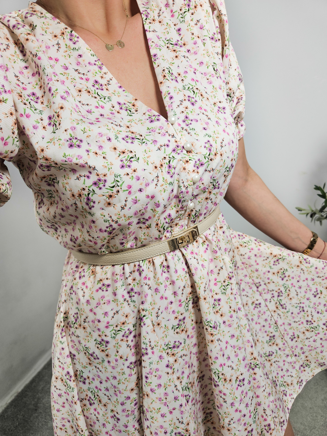 Sukienka zapinana z przodu na guziki, rękawki wykończone gumką.