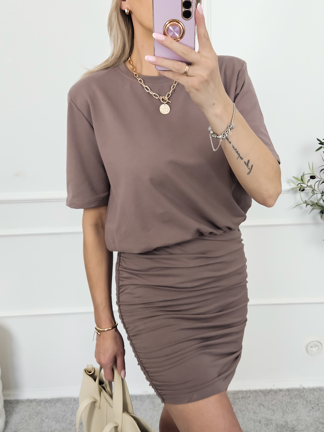 Sukienka wykonana z dresówki - model elastyczny , posiada poduszki na ramionach , drapowania- dzięki czemu ukryjesz niedoskonałości.